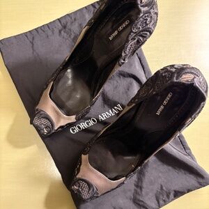 Authentic GIORGIO ARMANI couture silk open-toe heels, made in Italy, size 39. Gorgeous light silver/grey silk base with black lace appliqué.