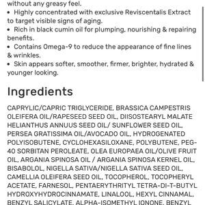 What it is: An oil infused with a potent concentration of exclusive Reviscentalis extract that targets major signs of aging. What it does: This recovery oil targets fine lines, wrinkles, dark spots, dryness and sagging skin. Rich black cumin oil plumps, nourishes and helps repair the skin, while omega-9 activates the synthesis of skin's lipids to diminish the appearance of fine lines and wrinkles and soothe skin.