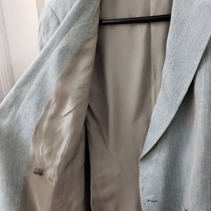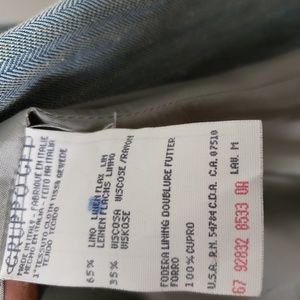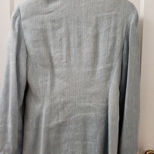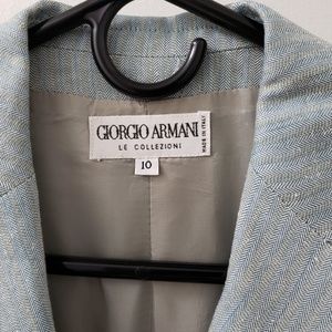 This Giorgio Armani Double Breasted Herringbone Blazer is super CHIC! This blazer is used but it is in great condition. Blue and gray stitch herringbone print throught. Dual side pockets, double breasted button closure, fodera lining. Made in Italy, size 10.
