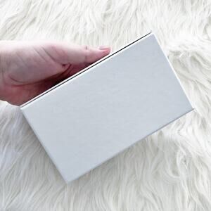 Small gift box (or decorative box) with white pearlescent background with black writing. Internal cardboard packaging that can be removed yet there are some glue streaks without it. Empty box.