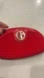Giorgio Armani beauty. Elegant red wristlet with gold accents. Sleek design with wrist strap. Perfect for any occasion.