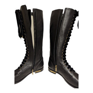 Make a bold statement in these Giorgio Armani runway knee-high boots crafted in luxurious black leather with an elegant lace-up front and a striking gold-tone heel. A rare piece from Armani’s runway collection, these boots balance timeless sophistication with modern edge.