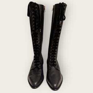 Designer, Lux, Quiet Luxury, Made in Italy, Punk, Dark Academia, Witchy, Goth, Keywords: Giorgio Armani boots, Armani runway shoes, lace front knee high boots, gold heel designer boots, Italian luxury footwear, black leather lace up boots, statement runway boots, Whimsy Goth, Runway, Equestrian, All Season, forever boots