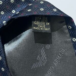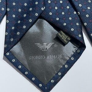 This Giorgio Armani men's blue geometric silk necktie is a classic and stylish accessory handmade in Italy. Featuring a geometric pattern in a classic size, the tie is crafted from 100% silk for a luxurious feel. With a pointed style and adjustable feature, this tie is perfect for any occasion and exudes a sense of retro, abstract, and old money themes. Elevate your wardrobe with this handcrafted piece from the iconic Giorgio Armani brand.