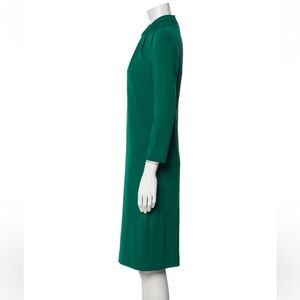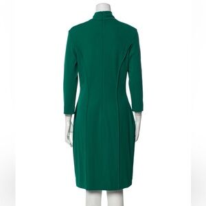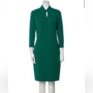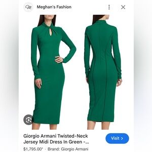 Gently used green Giorgio Armani twist neck, knee length, fully lined dress. Pics of dress with the shorter hem and sleeves are of the actual dresss for sale. Identical dress (except for sleeve and hemline length) worn by Meghan Markle, Diane on Y&R, and Deborah Roberts on Good Morning America. Sleeves and hemline professionally shortened. Internal fabric tag removed. Material does have some stretch and dress is designed to be form fitting. Ask any questions.