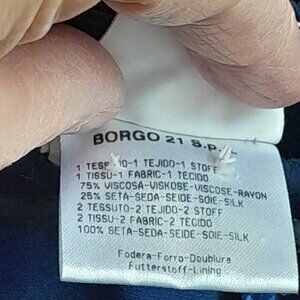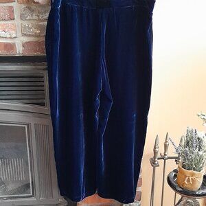 Dark Blue velvet effect pants with black accent back of waist with viscose and silk. There is a impression were the left pant leg were it hung on the hanger. Shows when light hits a certain way. Can't get this dry cleaned since my dry cleaner went out of business. Side zip. Approx. Waist 38", Length 37", Inseam 28" Cuff Width: 11" Pet friendly home