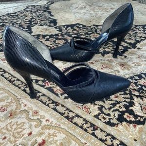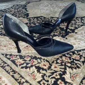 Giorgio Armani Black Leather Shoes. Reptile Print. Criss cross front.