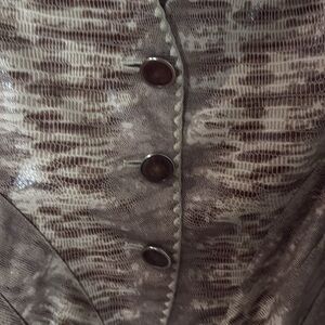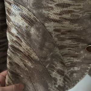 Chic Giorgio Armani blazer in a textured lamb skin snake design. Features a stylish button closure. Beautiful and shiny tan snake skin look. Brown and silver buttons. Perfect condition. Smoke-free home.