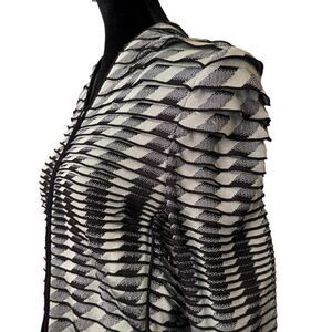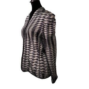 Good condition. Some fabric pulls are noted. Sleeves were worn rolled, minor rolling remains. Zipper is dual and works well. Material has stretch. Peplum shape with structured shoulders.