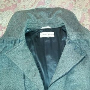Grey twead with black zippers and buttons. Belt in back to sinch waist. Size 36