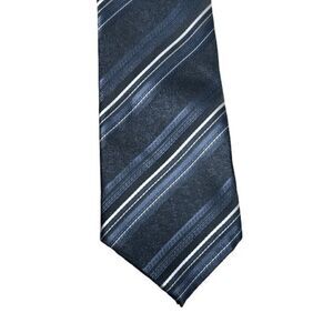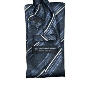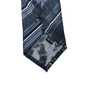 Giorgio Armani 100% silk tie with dark gray, white, blue stripes. Measures 4" in width. No visible stains or tears.