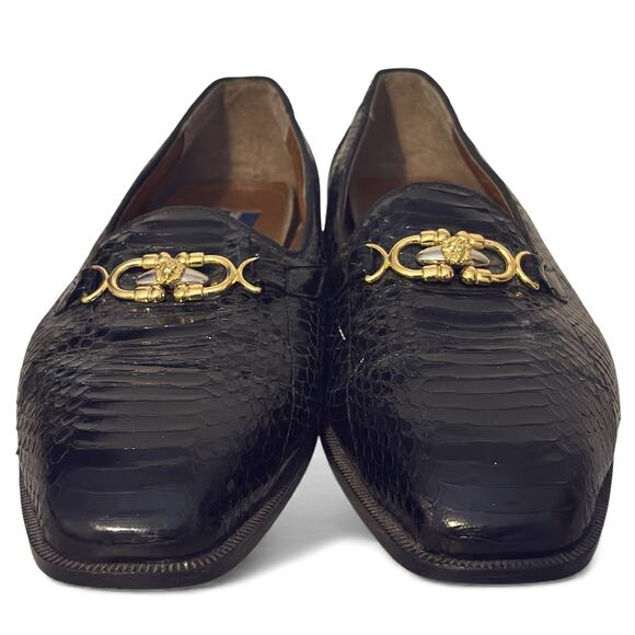 Giorgio Brutini Mens Black Snakeskin Loafers Size 9 Gold Lion Medallion Vintage