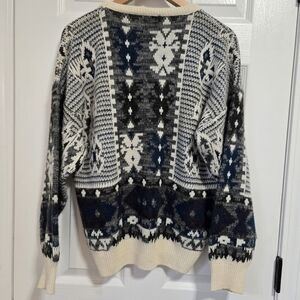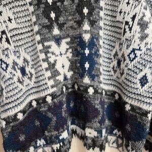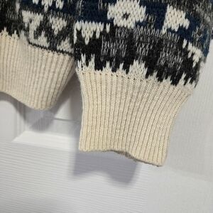 70% acrylic, 30% wool. Gorgeous vintage sweater. One small hole in front as shown. Small spot that has the knit stretched out a tiny bit I tried to show. Warm and soft with some stretch to it. Size Medium.