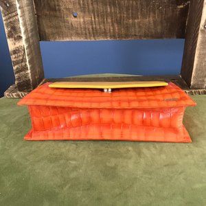 This Giorgio Fabiani leather handbag can be used as a clutch bag or shoulder bag. The shoulder strap is not detachable but easily folds inside the bag. The croco finish is on the orange leather section and strap while the mustard color flap is smooth. There is a magnetic closure and one interior zip pocket. The bag measures