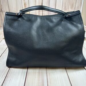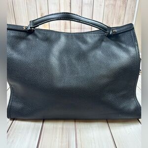 The Giorgio Fiorelli handbag features a sophisticated black design with a luxurious textured finish and a striking gold-toned clasp. Its structured silhouette and classic style make it a versatile accessory for both day and evening occasions.