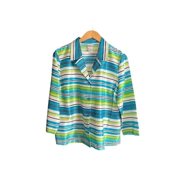 Giorgio Fiorline Stripe Blouse Size 14 Shiny Blue Green Button Front Vintage 90s