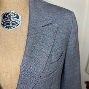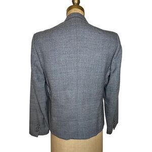 Vintage Giorgio Sant’Angelo Grey checked 100% Pure New Wool shorter length Blazer. Has a fine red line thru check Single breasted and single buttoned. Is in tiptop condition please check measurements for size