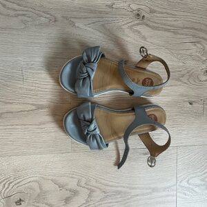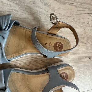 The large leather bow gives that touch of elegance. Ankle strap with buckle.