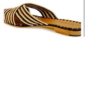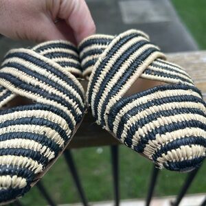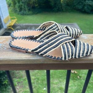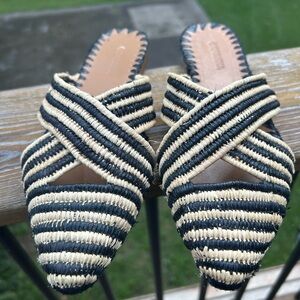 Raffia pointed toe criss-cross striped mule in black and natural.