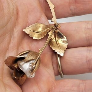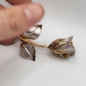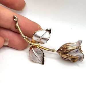 Giovanni Silver and Gold Tone Rose Pin 3in | Materials: gold metal alloy, silver metal alloy | Length: 3in long | Clasp: brooch pin back | Signed? Giovanni | Excellent vintage condition