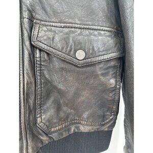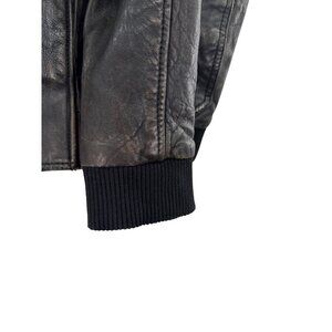 The jacket shows minor wear and slight discoloration on the leather, typical for pre-owned items.