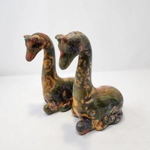 Giraffe floral patchwork decoupage glazed ceramic 7" figurines, set of 2 sitting animal figures. Vintage Figural Home Decor