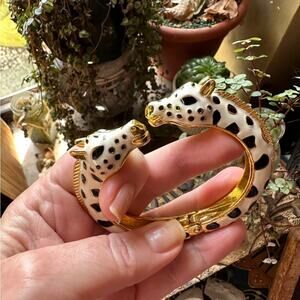 This striking giraffe head hinged bangle bracelet features two sculpted giraffe heads meeting at the center, finished in a rich gold tone with white and black enamel giraffe-style spotting. The elegant elongated face, upright ears, and signature horn-like details clearly reflect a stylized giraffe design.