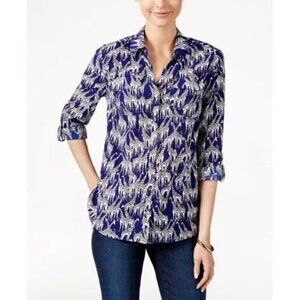 Giraffe Print Womens Blouse L Charter Club Button-Up Shirt Blue White Tab Sleeve