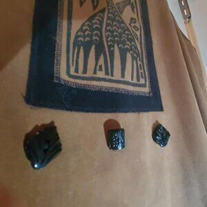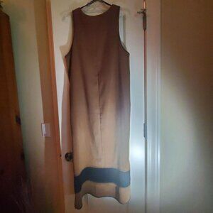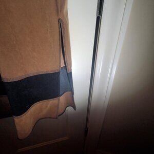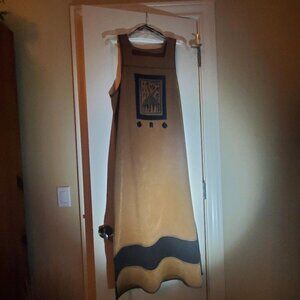 Soft, faux suede camel jumper with black giraffe motif and 3 primitive design black buttons, side slit. 97% polyester, 3% spandex. P2P 20", length 48".