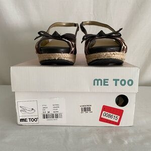 Strappy giraffe print (that feels like fur) wedge heel with 2.5" heel. Elastic ankle strap for comfort, natural fiber covers wedge, and cute bow accent. Worn a couple times. They are fairly narrow for a M width shoe. Comes with original box. Made in China.