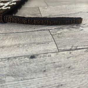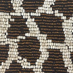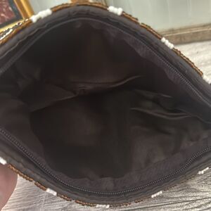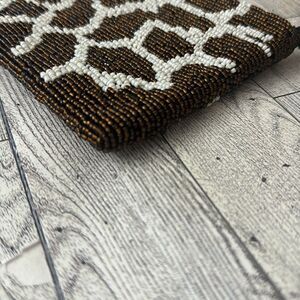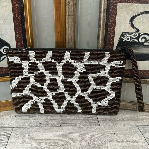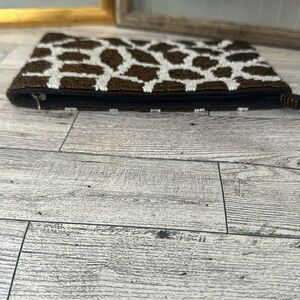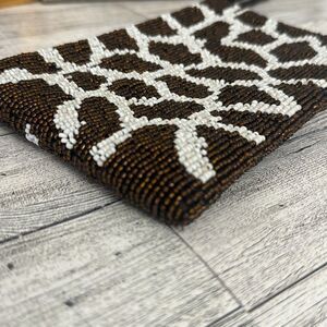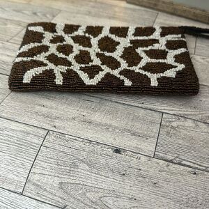 Giraffe Pattern Beaded Wristlet. Very good preloved condition. Brown & off white exterior beading with brown interior lining. Measures 7.5” x 4.5” with a 5” wrist strap.