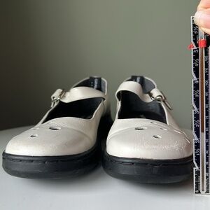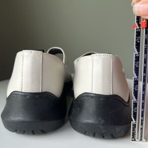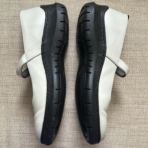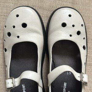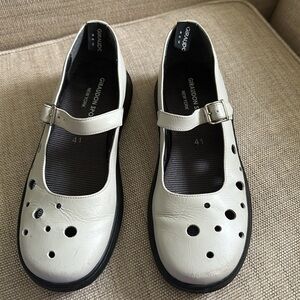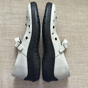 Giraudon Sport New York Mary Jane style shoes in white with a black sole. The shoes feature a round toe, a strap with a buckle, and decorative perforations on the upper. The brand is known for its classic yet creative designs and lasting quality. Giraudon shoes are handmade in Portugal and have a reputation for being well-constructed. While the brand is no longer in business, its unique designs are still sought after
