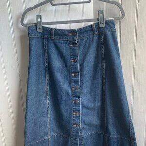 Super cute and Classic A line Denim Jean skirt with branded buttons down the front. Versatile piece for so many combinations with your wardrobe. Very gently used condition. Nice denim, 100% cotton quality.