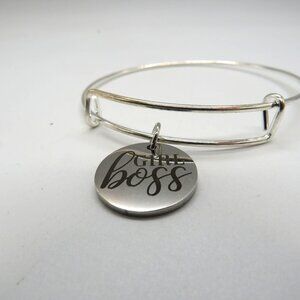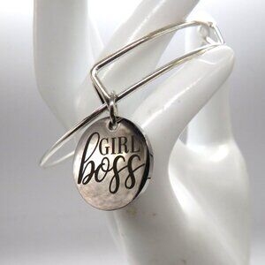 Girl Boss Bracelet Silver Tone Charm Bangle Black Etched Lettering Adjustable