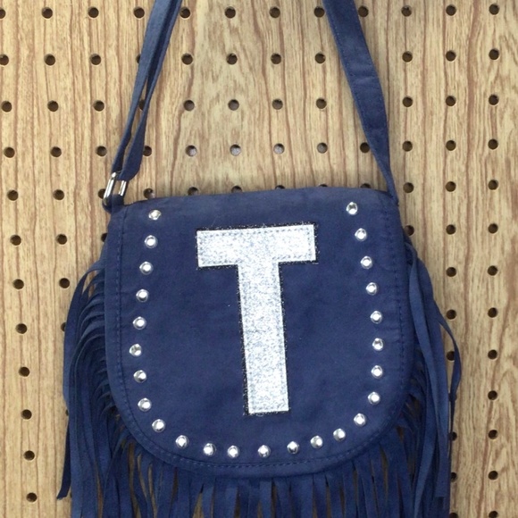 Beautiful one open pocket, blue fringe purse, has the initial T in silver, metal stud trim and velcro closure.Condition like new! Adjustable strap