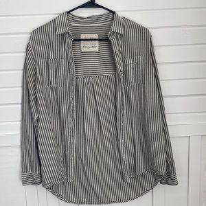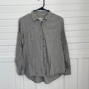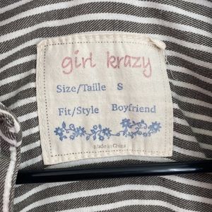 Girl Krazy Classic Gray & White Striped Button Down Boyfriend Fit Size Small. Comfy, lived in feeling, gray and white striped button down. Front pockets, round hem, extra buttons and pleated in the back to add a feminine flare!