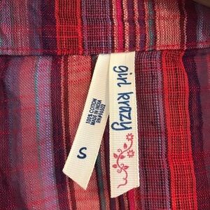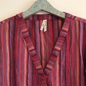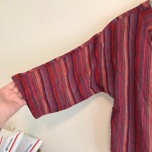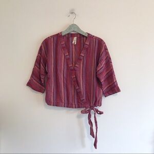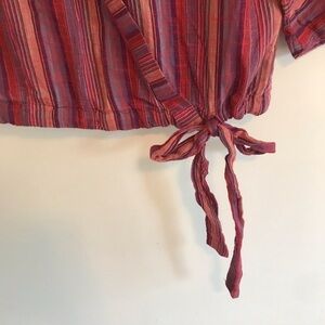 Features: 100% cotton, Vertical pink stripes, three-quarter length sleeves, wrap front. Slightly cropped length