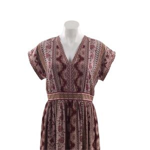 with burgundy, beige and pink floral stripe panels. Design V neck, floral panel waistband. Cap sleeves, side front, modest slit, fully lined, hidden back zipper. Vintage wallpaper was the inspiration behind the pretty blooms that Blossom in color all over this soft Charmeuse Dress Size 8 approximate measurements. Armpit to armpit 19 1/2 inches waist 16 inches length 49 1/2 inches