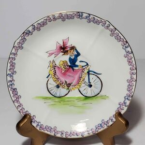 Vintage teacup and saucer. Girl in dress on bike. Floral border. Hand painted. Few spots under the glaze from production. Unique pattern.