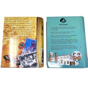 2-Girl Scout Beginnings- JGL on the cover with pictures of early Girl Scouts. Back has pictures and info about early GS activities. Inside top details JGL first phone call regarding GS. Small areas of rust inside and one small area on the back. Slight dent in "spine" area.