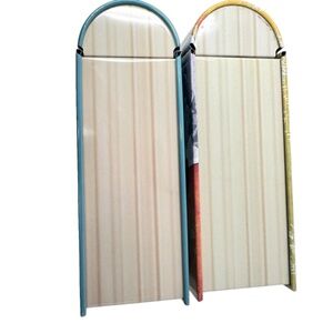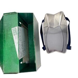 3-Girl Scouts Going Places- tote style tin with ribbon handles. Pictures of earbuds/ticket. on one side, picture of tied scarf on the other and pics of various items on the top as if the tote is filled. Minor superficial scratches.