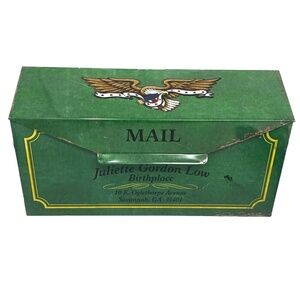 1- Green mailbox - complete with Juliette Gordon Low's address on front, eagle on the top, graphics on back, postcard graphics inside. Mounting holes for hanging.Graphics have a distressed quality. Appears to have a small amount of dried fingernail polish near top edge in front - not visible with lid closed. Occasional superficial scratches.
