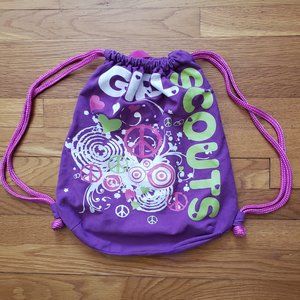 This is an official Girl Scout drawstring backpack or backsack. Purple backpack with pink, green and white design and pink drawstrings. Handle on the back of the bag.
