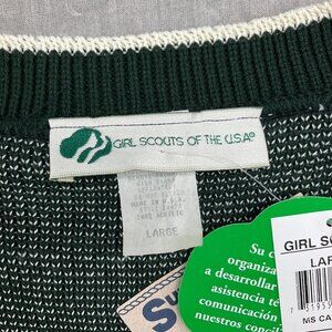 This Girl Scouts of USA Cardigan is a vintage, new with tags, large size sweater. The green and white fleck pattern is made from warm acrylic material.