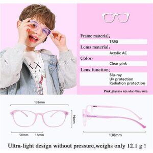 * Comfortable & Lightweight & Durable -- The kids blue light glasses are suitable for kids, teens, girls, boys ages 5-13. Ultra-Light design is very lightweight and comfortable to wear, weighs only 12g, fits the nose bridge without pressure when playing game or studying. And very clear AC lenses for not blocking view, anti-glare, anti blue ray and anti-eyestrain.