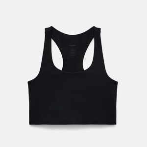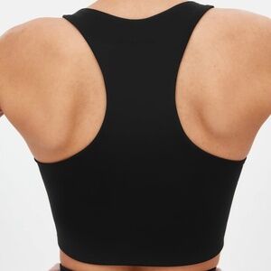 Girlfriend Collective Paloma Racerback Bra. Color: Black. Size: XS. Racerback. Scoop neck. Built-in support band. Form-hugging fit. Double lined, sweat-wicking material with four way stretch. Made with COMPRESSIVE for smoothing, sculpting support. Compressive is made with 79% recycled water bottles (RPET) and 21% spandex. Designed for medium impact activities.