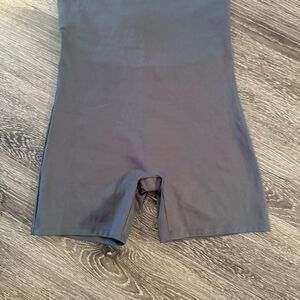 A bike short-length compressive unitard with a scoop neck, low back, and built-in bra.