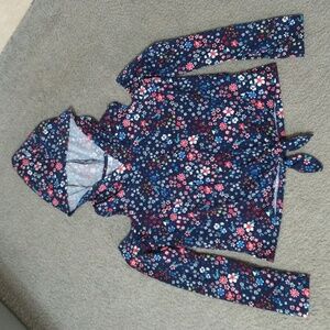 -shirt has hood, arm cutouts at shoulder area, ties in front