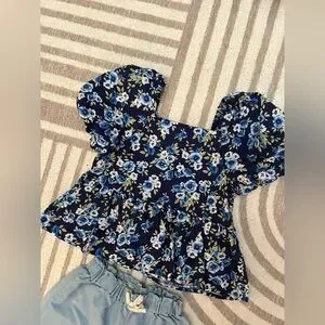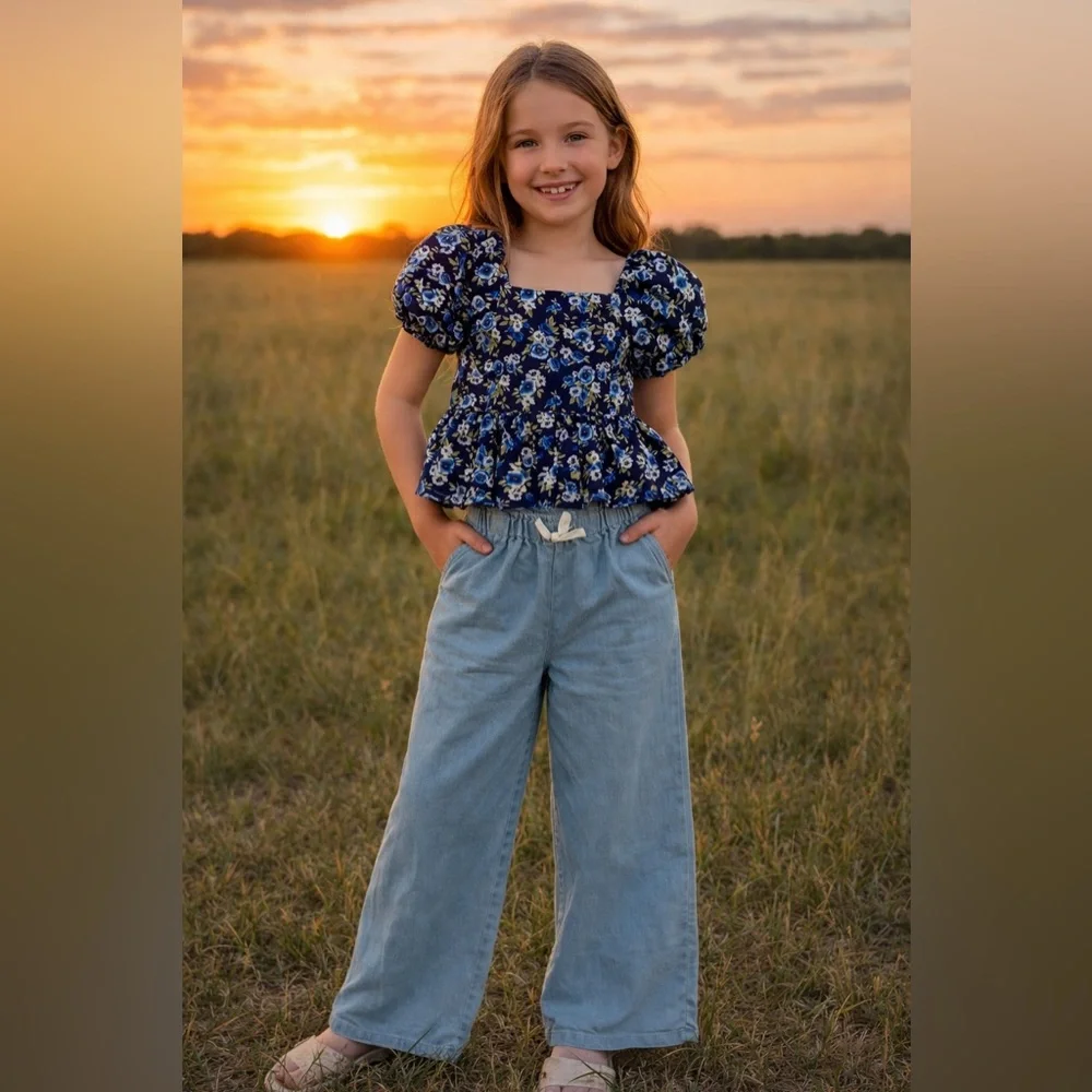 Adorable and stylish 2-piece girls outfit perfect for spring, summer, or back-to-school! This set features a navy floral peplum top with sweet puff sleeves and a button-down back for easy dressing. Paired with comfy light blue wide-leg pants with an elastic waistband and functional pockets. Super cute worn together or styled separately!
