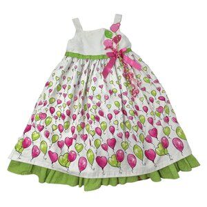 • White Sundress with Pink & Green Balloons - some in Heart Shapes, White Underskirt with Lime Green Ruffle with White Dots, Lime Green Ties with White Dots for a Bow in the Back. Balloons, Curly Strings, and a Pink Bow. Zips Down the Back.